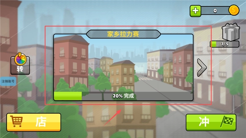 4、在家乡拉力赛板块里,进度条显示已完成20%,旁边的礼物盒图标标注着1/5。界面左上角设有一个带有“转”字的彩色按钮。