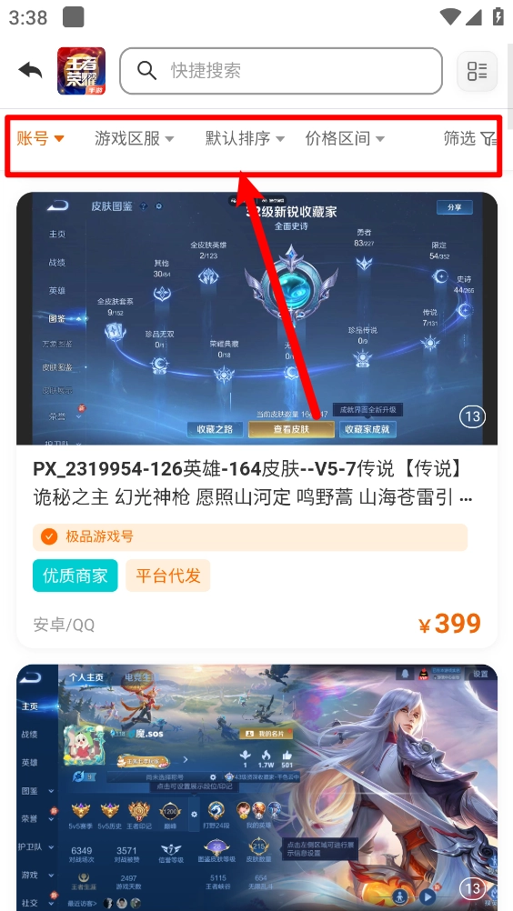3、例如点击“王者荣耀”进入,能够依据游戏区服、价格等条件开展筛选。