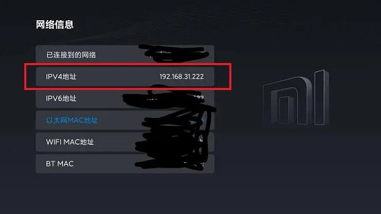 接下来要查看电视的IP地址,具体操作是进入设置界面,点击“关于”选项,然后进入网络信息页面。就像图中展示的那样,把电视的“IPV4地址”记录下来。