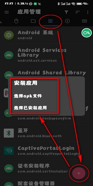 完成连接后,在应用管理界面点击上方红框标注的选项,接着点击右下角的“+”号,就能进入应用安装流程,按照实际需求选择并安装相应应用即可。