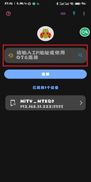 打开手机里的甲壳虫adb助手应用,在搜索栏输入之前记下的地址,等搜索结果出来后,点击“连接”按钮就可以了。