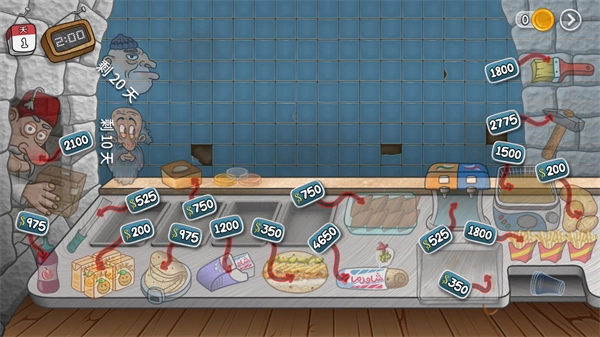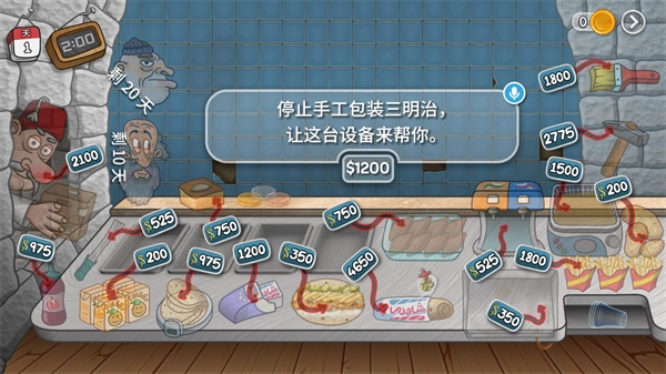1、优先升级“员工老头”:花费2100金币,就能让酸黄瓜、沙拉酱、橙汁、番薯实现自动化补充,这个选择的性价比相当高。