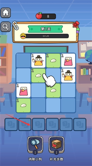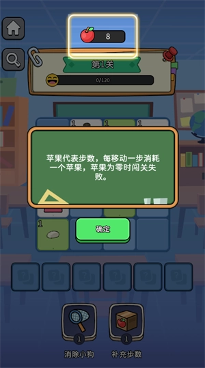 苹果代表步数,每走一步就会消耗一个苹果,一旦苹果数量变为零,闯关就会失败。