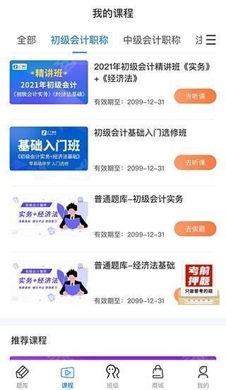 1、打开软件并完成登录后,点击底部菜单栏中的“课程”按钮,就能看到已激活的课程,点击“去听课”按钮便可开始听课。