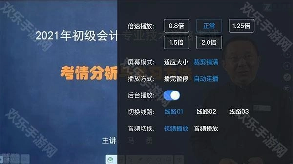 4、课程支持全屏播放,在全屏播放页面同样能调整播放速度,并且可以选择仅播放音频、切换视频的播放线路等。
