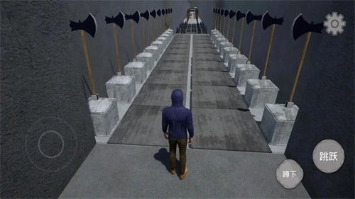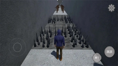 画面右下角设有蹲下和跳跃按键,玩家可点击操作;面对特定机关时,需借助跳跃动作来避开各类危险。