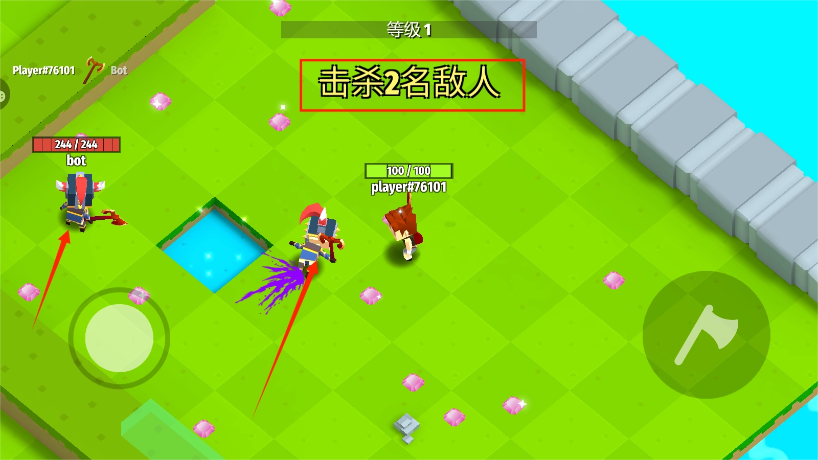 核心玩法为俯视角的竞技场对战,玩家借助虚拟摇杆操控角色移动,点击对应按钮即可投掷武器。击败对手可获得积分,坚持存活至最终阶段即为胜利。