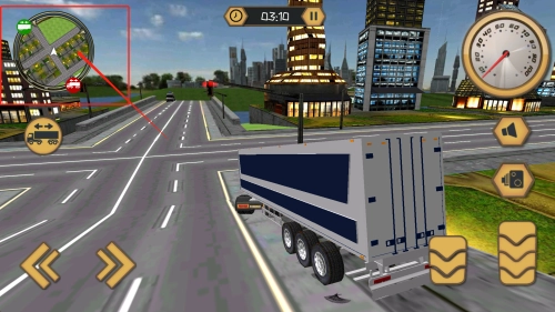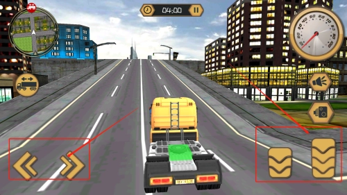 点击屏幕下方的左右按键来控制大车的行驶方向,通过点击下方的刹车和油门按键来调节大车的速度。