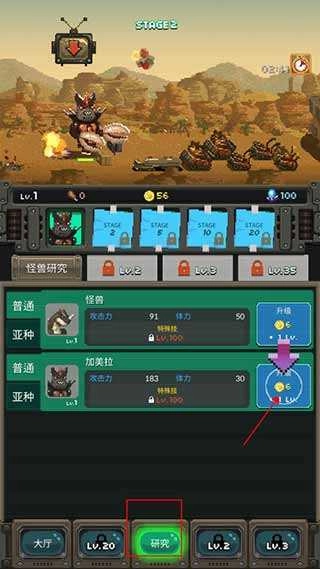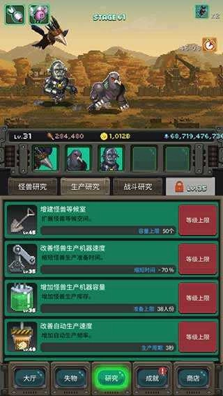4、随着游戏难度逐步提升,点击“研究”按钮还可以对怪兽进行升级操作;