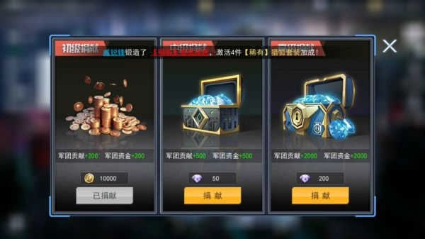提及军团贡献,正好给大家介绍一下捐献系统。捐献设有三个等级,不同等级对应着相应的军团贡献与军团资金。其中,军团贡献可供玩家在军团商店兑换各类物品,军团资金则是军团大厅升级过程中不可或缺的条件。