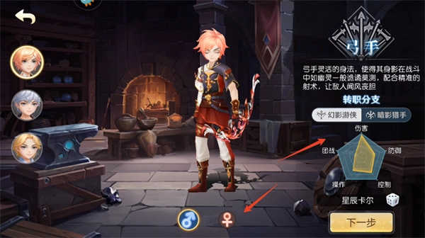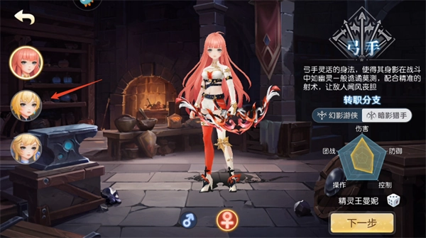 进入游戏后,首先映入眼帘的是弓手职业,该职业能够转职为幻影游侠与暗影猎手两个方向。其中,幻影游侠侧重于提升个人作战能力,不仅拥有高额伤害输出,还具备一定的控制技能和位移手段,防御能力也处于尚可水平,在团队战斗中更倾向于独自行动。