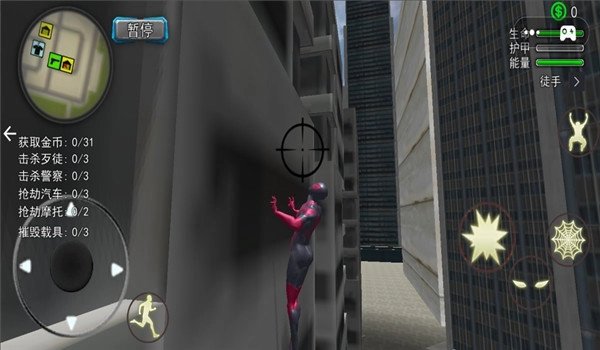 1、借助蜘蛛绳索在城市建筑之间快速穿梭,完成高空摆荡与垂直攀爬的动作,重现超级英雄的敏捷身手。