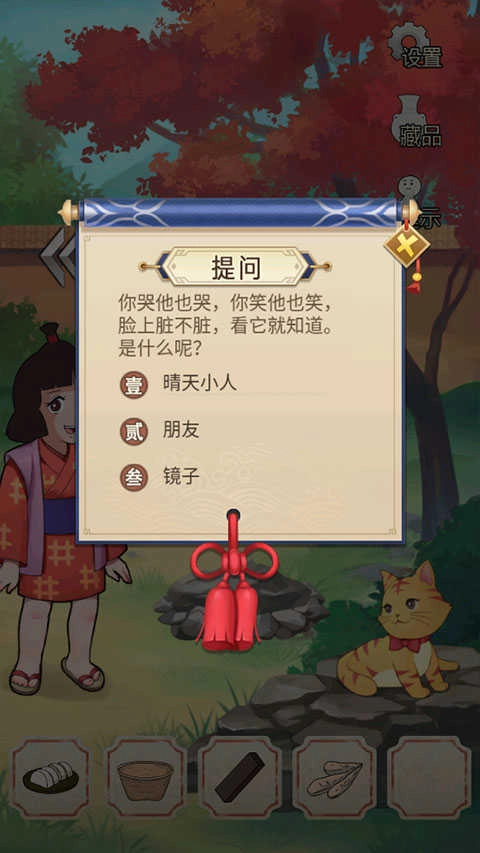 8、点击屏幕左侧女孩小叶子进行对话,回答问题:镜子、锅、雨,即可获得一根绳子。
