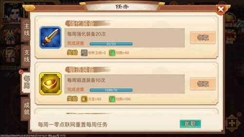 每周任务聚焦角色养成维度,涵盖武将强化、装备升级、圣兽征伐、副本挑战、元宝消耗及周目达成等方向,产出均为实用型养成资源,属必做日常内容。其中圣兽挑战对新手稍具门槛,但坚持一周积累,足以稳定通关。
