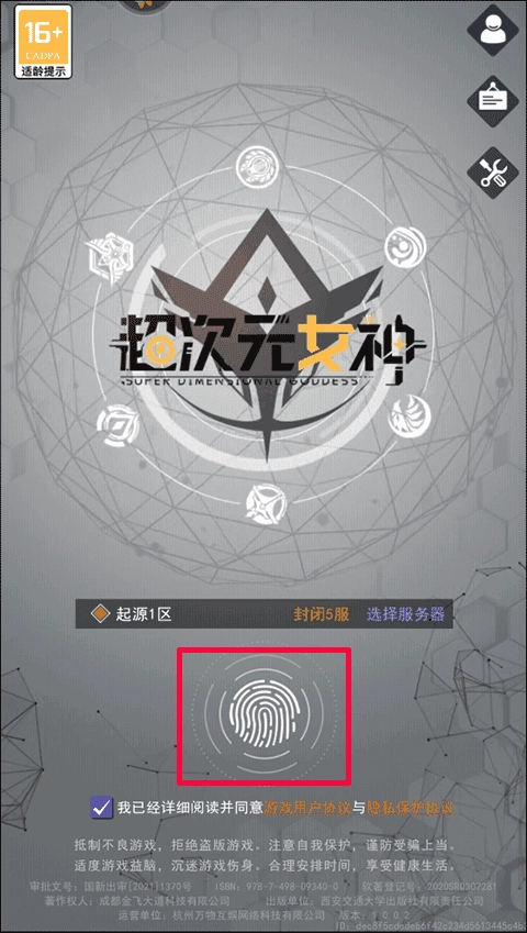 1、游戏启动后,在主界面勾选“我已阅读并同意用户协议与隐私条款”,接着长按红色框中的指纹识别区域就能进入游戏。