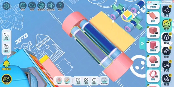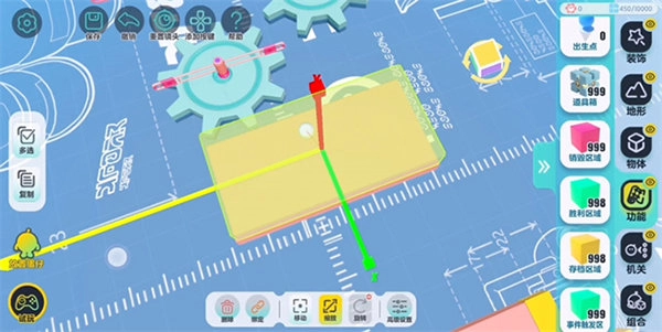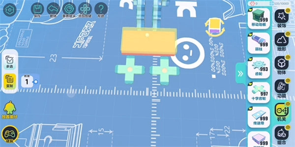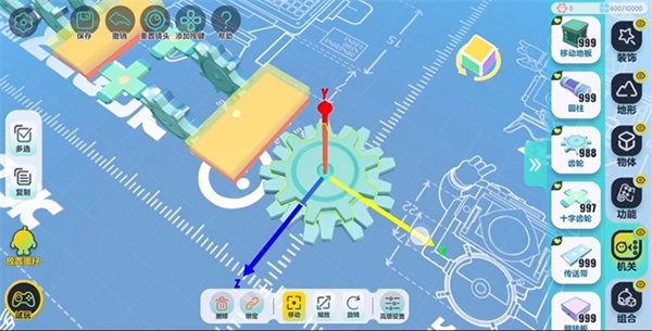 为了操作更便捷,在正式开始搭建前,要把设置里的编辑视角切换成【上帝视角】。从机关里找到“齿轮”并拖曳出来,就能完成“齿轮”摆放的基础操作。除了常规摆放外,还能点击【旋转】让“齿轮”竖起来,也可以通过调整【缩放】来改变“齿轮”的大小和侧面宽度。等尺寸调整好后,点击左侧的【复制】按钮,就能批量复制已调整完毕的组件,从而起到节省时间、提升效率的作用。