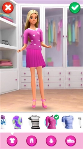 4、在芭比时尚衣橱使用上百种衣服组合来创作你自己的时尚外表。