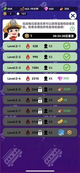 5、只有通关最后一关才能获得勋章,累积勋章能显著提高金钱收益,不过勋章也会增加次日的任务难度;
