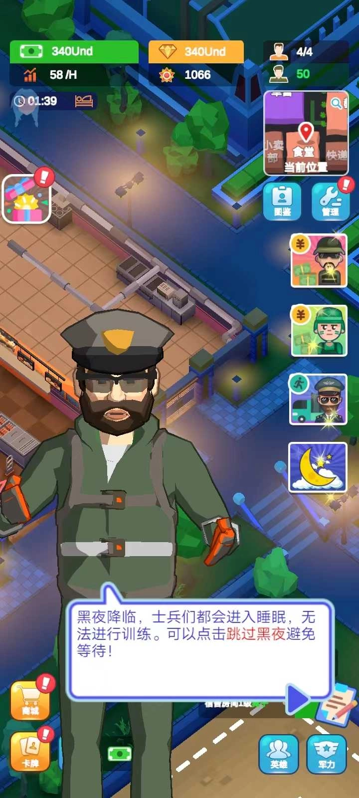 9、当夜幕降临,士兵便会进入休息状态,无法开展训练。这时可以选择跳过黑夜,从而获得一定的资金补贴,以免浪费时间。