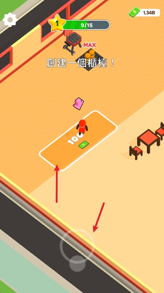 1、拖动屏幕就能操控角色移动,抵达指定位置后便可消耗金钱建造设施。