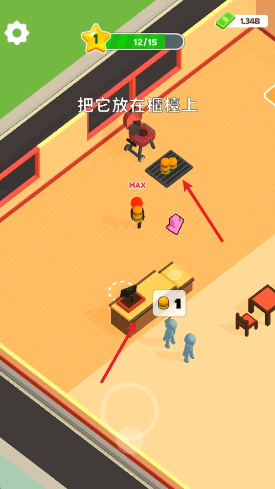 基础运营流程:游戏开局后,玩家得前往食材区域把原材料搬运到出餐台。等汉堡制作完成,就把它送到收银台交给顾客,同时收取顾客留下的金币。