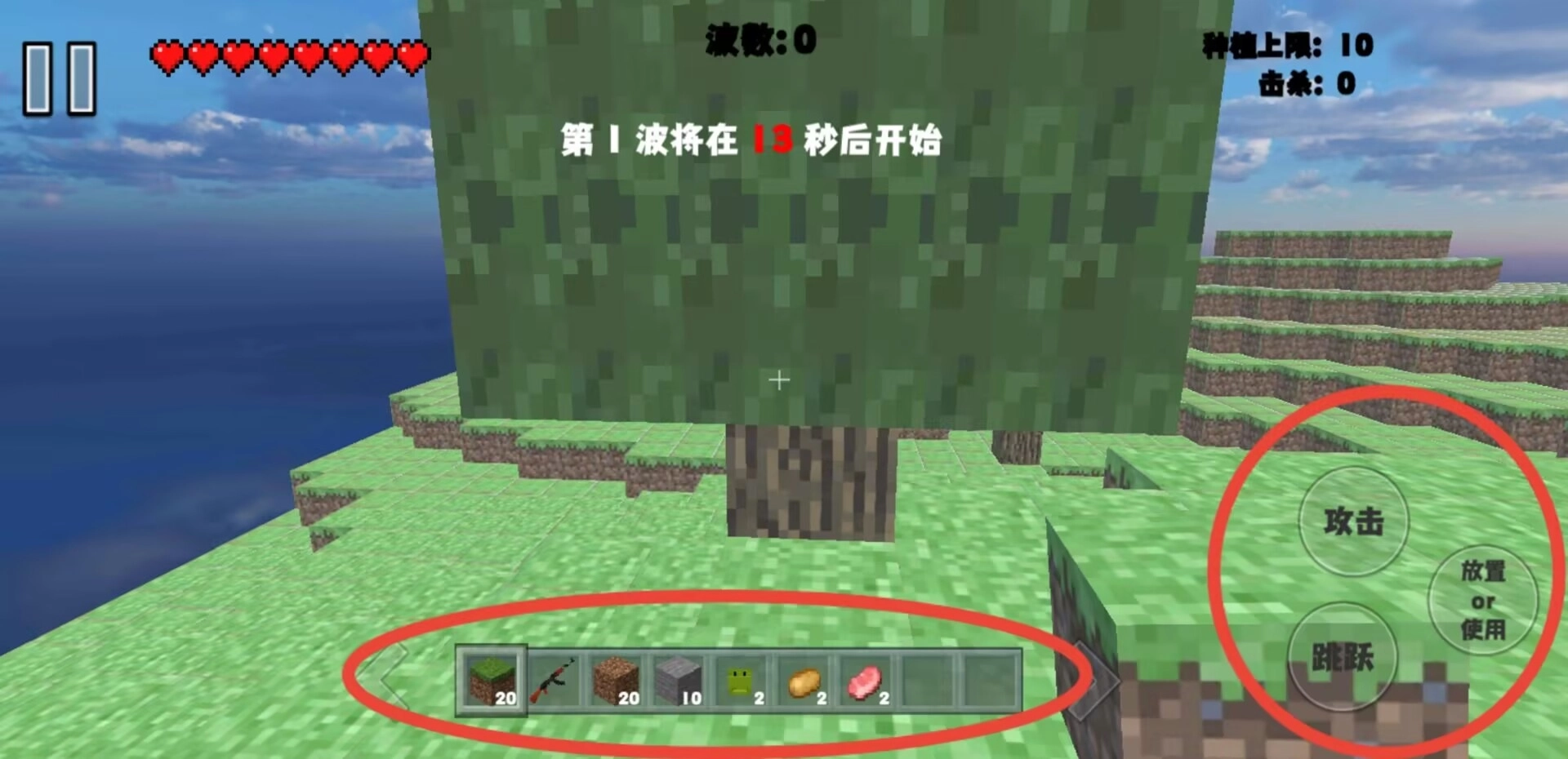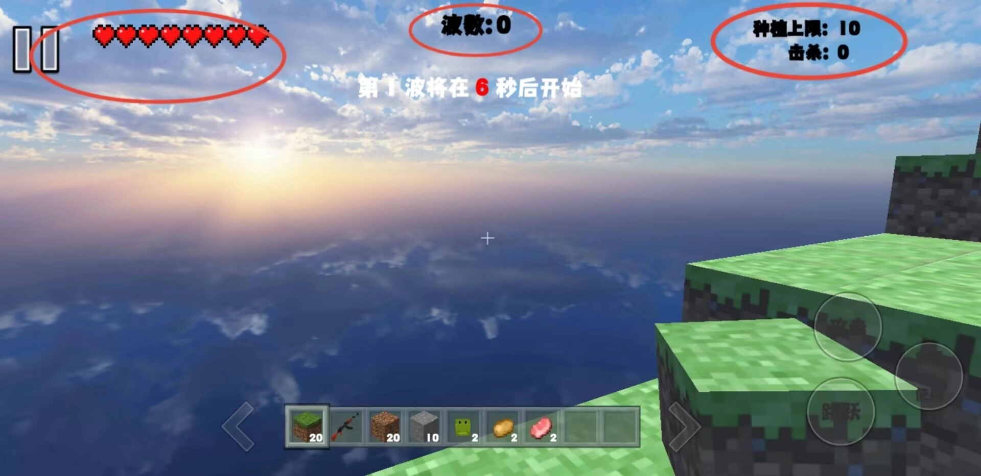 2、界面左上角展示角色生命值和暂停功能,顶部中央标明当前攻防波次,右上角统计资源上限与实时战绩数据。
