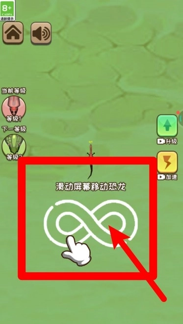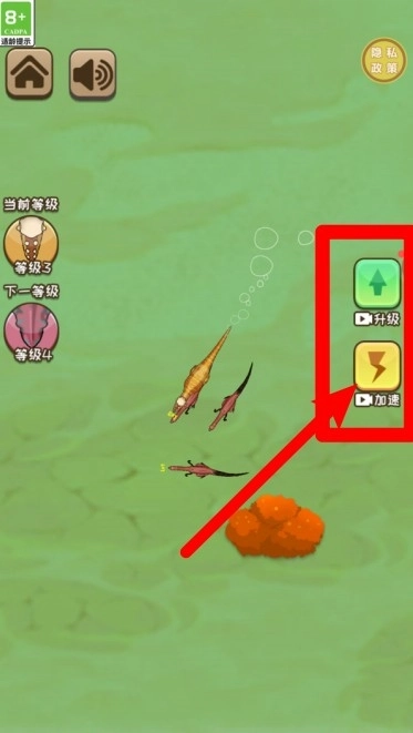 1.点击右侧按钮可以选择通过观看广告来实现升级或加速,助力你更快速地提升恐龙等级并提高移动效率。
