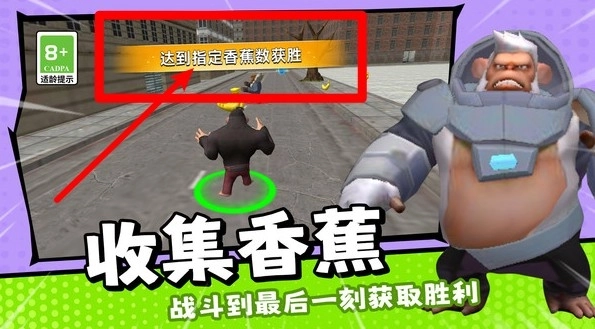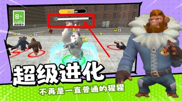 1.收集食物进化:操控角色移动以获取香蕉和地图上的能量道具,不断成长并提升进化等级,进食速度越快,角色变强的速度也就越快。