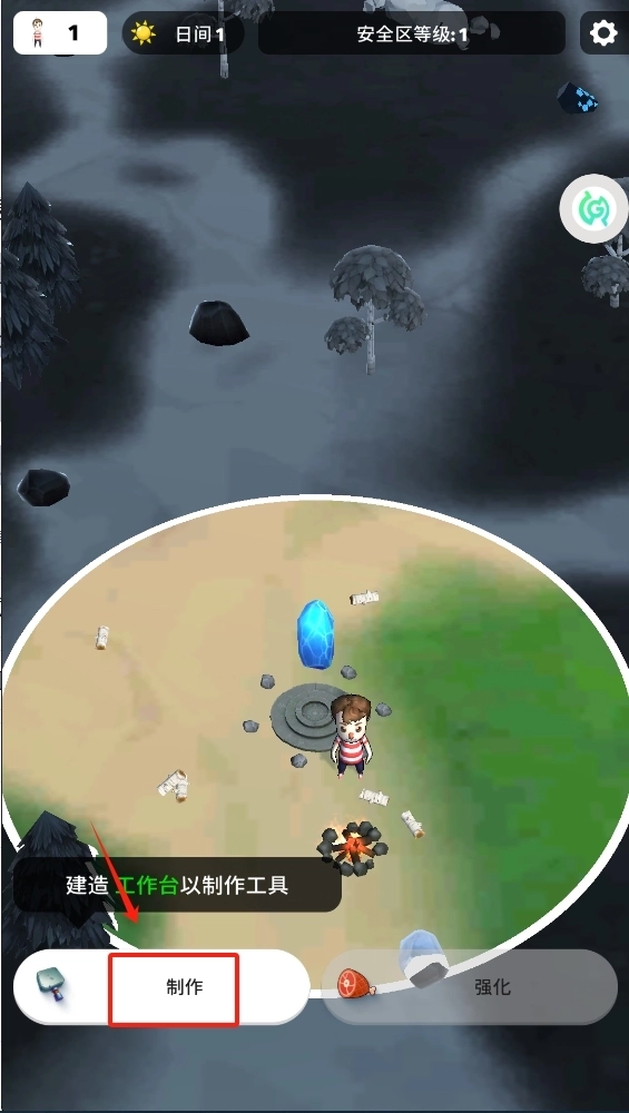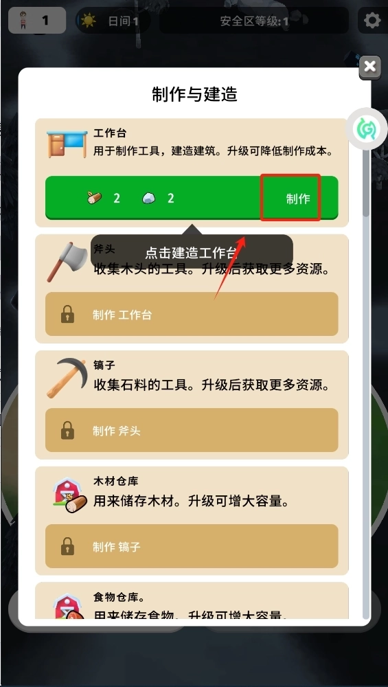 1、第一步,点击制作按钮来启动工作台的建造流程,这可是生存下去的根基所在。