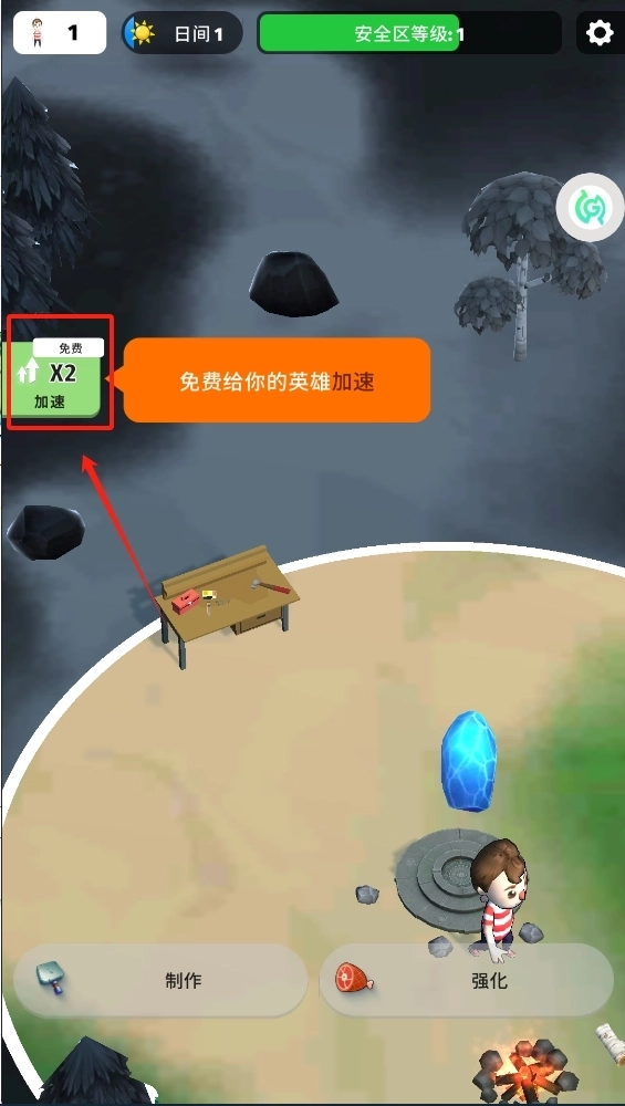 4、点击免费加速功能,能够快速完成工作台的建造,以此节省时间,进而提升生存效率。