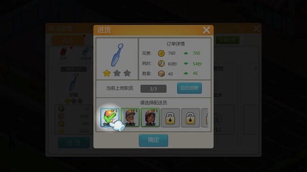 具备了收银员和配送员,基本工作就算告一段落,下一步需要学习如何补充货物,点击右下角的“货物”按钮,打开商品管理,点击“进货”并指定一名配送员即可。