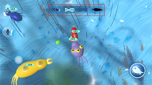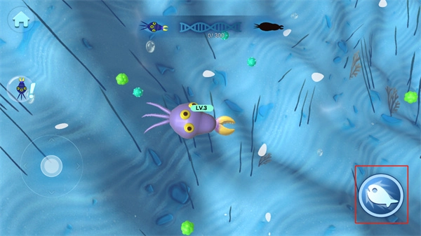 3、游戏界面右下角的按键能够助力细胞实现快速移动,既可以借助它帮助细胞捕捉等级低于自身的细胞,也能通过该按键让细胞躲避等级高于自身的细胞。