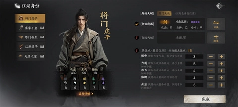 1、玩家能够挑选江湖身份,选定初始武器,自主选择天赋,并且分配属性点。