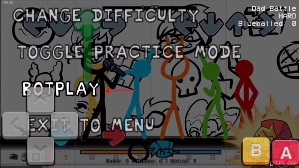 3、对战时按下返回键,找到“botplay”选项并点击,就能开启自动演奏模式。