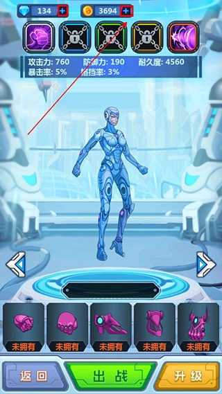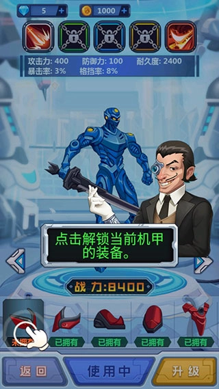 2、提升机甲的各项属性,收集各类稀有材料,让你的机甲战无不胜,赢得所有的荣誉;