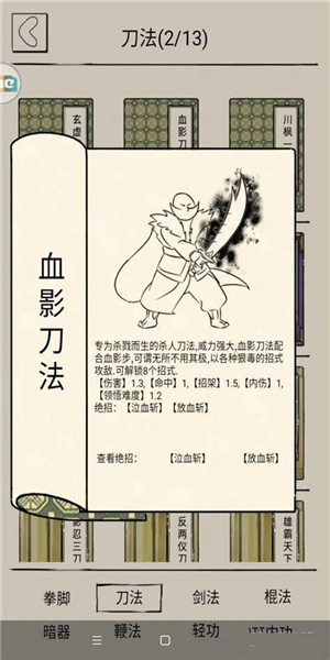 1、第一种是选择血影刀法,这套刀法有两个绝招,分别是泣血斩和放血斩。其中泣血斩是血刀的核心伤害技能,不仅伤害数值高,命中率也十分出色,搭配血刀门的内功心经,能在角色血量极低时实现反杀;放血斩则是前期过渡使用的技能,命中和伤害表现都比较普通,但带有附加的流血效果,属于消耗类技能。关于刀法的加点,常规推荐6111的加点方式,这样能让伤害达到较高水平。