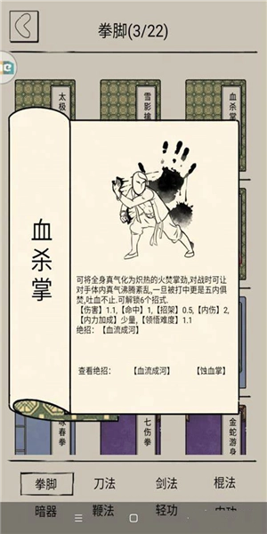 2、第二种选择是拳法——血杀掌。血杀掌的绝招“血流成河”,既能造成伤害,又能附加流血buff;当攻击处于流血状态的敌人时,还能刷新流血的持续时间。另一招“蚀血掌”命中目标后,可造成伤害并施加负面血毒buff。总体而言,血杀掌的伤害相较于血影拳要低一些。