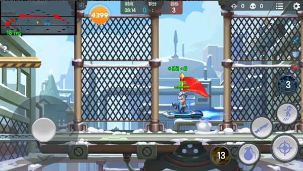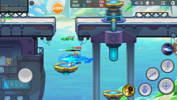 战斗中共有六个操作按键,分别对应手雷、跳跃、开火、闪现、大招和近战攻击。游戏界面里能看到自身与敌人的血条,人物移动较为频繁,我们的目标是在最短时间内消灭尽可能多的对手。