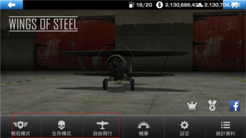 1、首先进入后能看到三种模式:战役模式、生存模式和自由飞行模式,点击机库即可更换飞机。