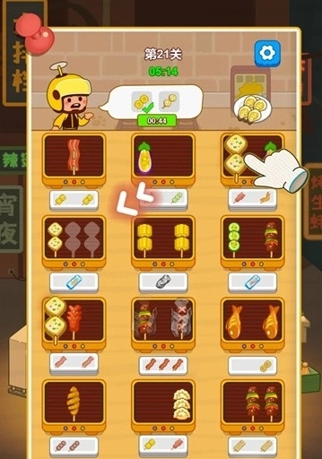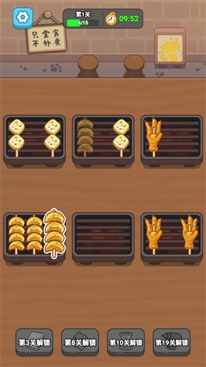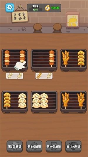2、玩家只需把三个一样的串串放在同一个烤肉盘里,就能完成消除。