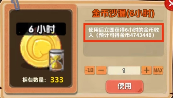小技巧:金币沙漏的效果是根据当前主线进度,一次性发放6小时的金币收入。建议不要领取后立刻使用,前期升级速度快,多囤几天再用,性价比会更高。