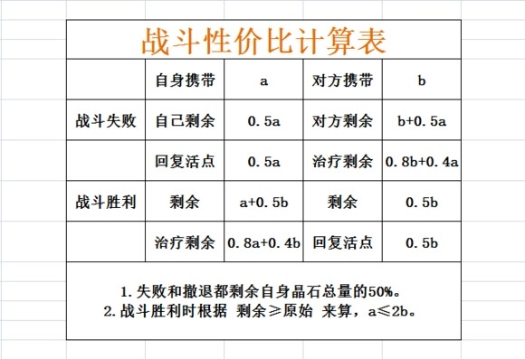 同样,从这张表格里能清楚看到:当你自身携带的晶石数量为100时,只要对面携带的晶石超过50,单从晶石数量的角度来看,打赢这场决斗至少不会亏本。不过这样的说法可能有点抽象,换个更直白的理解方式就是:如果你的晶石数量是对面的2倍以上,主动发起决斗是不划算的。举个具体的例子:假设你身上带了200晶石,对面带了80晶石。如果你主动挑战他,决斗结束后你会拥有240晶石,对面则剩下80晶石;但对面可以直接带着这80晶石回到复活点,而你治疗后反而会剩下192晶石,显然是得不偿失的。