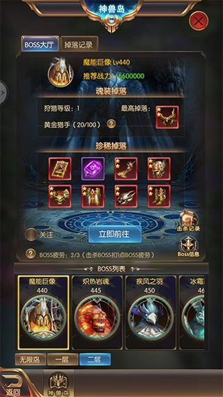 2、神兽岛的无限岛区域不消耗BOSS疲劳,而击杀一层和二层的BOSS会消耗疲劳值,每日疲劳消耗上限为3点,次日0点进行重置。