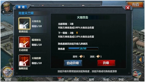 每艘舰船最多能拥有三个技能,包含一个普通攻击技能、一个主动攻击技能,以及一个旗舰技能(部分舰船没有旗舰技能)。所有技能都支持升级操作。技能升级时需要消耗特定数量的指定道具,使用道具后会依据一定概率出现两种情况:要么技能升级成功,要么升级失败但熟练度有所提升。