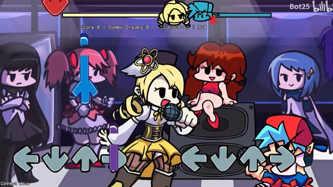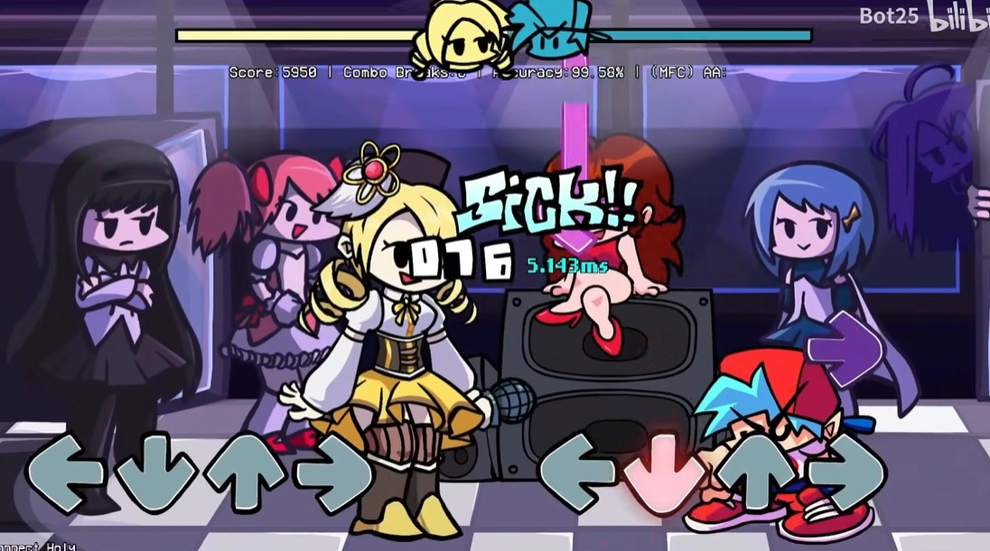 周五夜放克巴麻美模组是一款音乐节奏类游戏,由玩家自制而成,把魔法少女校园动漫里的角色融入其中。游戏采用经典的下落式音符节奏玩法,玩家需跟随节奏精准点击,以此获得更高分数来战胜对手。