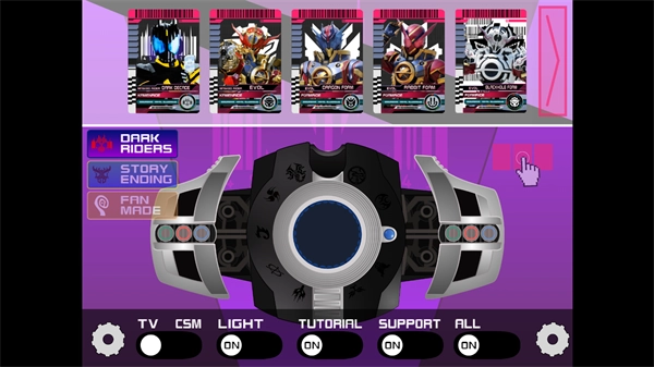 变身器的面板上设有多个功能按钮,每个按钮都关联着特定的声光反馈和形态变化。玩家点击不同按钮时,不仅可以触发炫目的光影效果和标志性音效,还能自由切换骑士形态,并释放相应的独特战斗技能。