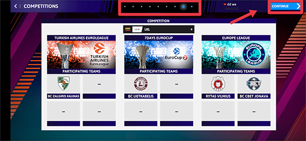 1、进入后,先根据进度条依次选择难度、地区、对手等相关选项,选好后点击右上角的CONTINUE按钮。