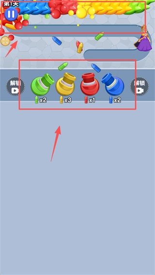 1. 玩家借助触控屏幕对魔法炮台的发射角度和力度进行调整,把彩色弹药精确地射向与之同色系的障碍物或者目标节点。
