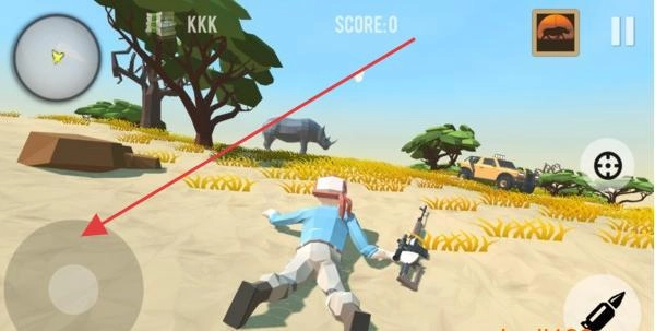 3、躲“犀牛”!被撞倒地,点左侧移动,绕树跑,3秒摆脱,每猎10只,领新枪(狙击+5),分数翻倍。
