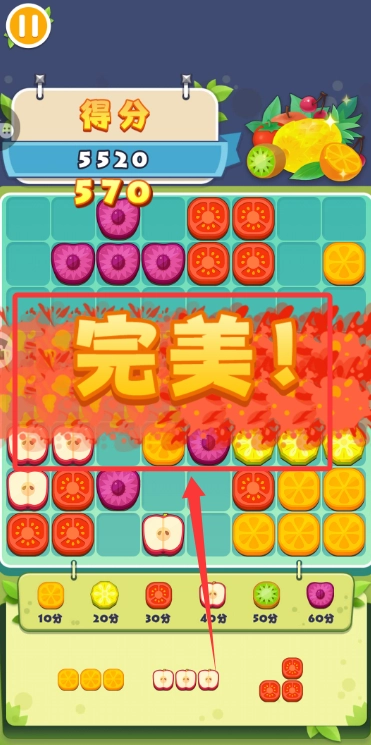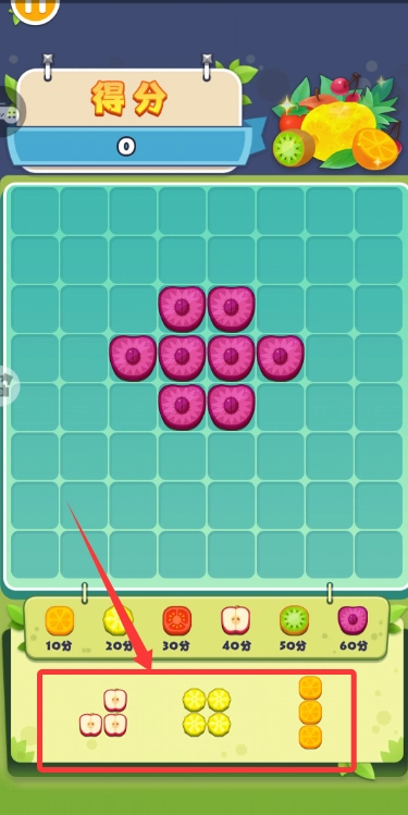 2、拖动下方水果组到棋盘,让三个及以上同水果相连,触发消除获取分数。